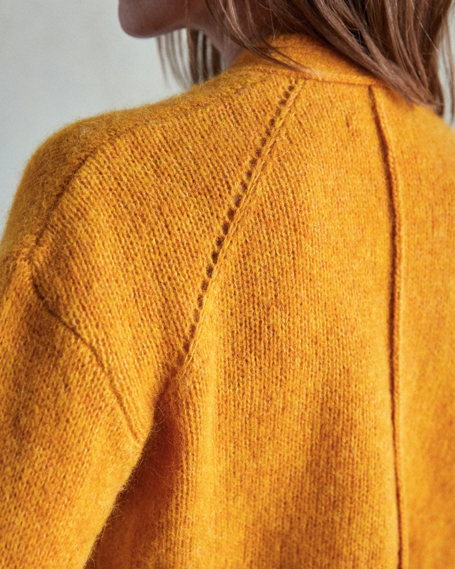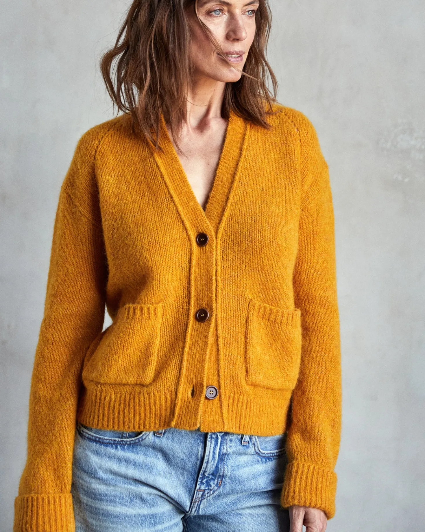 Light and airy 5-gauge yarn with ribbed cuff and hem.