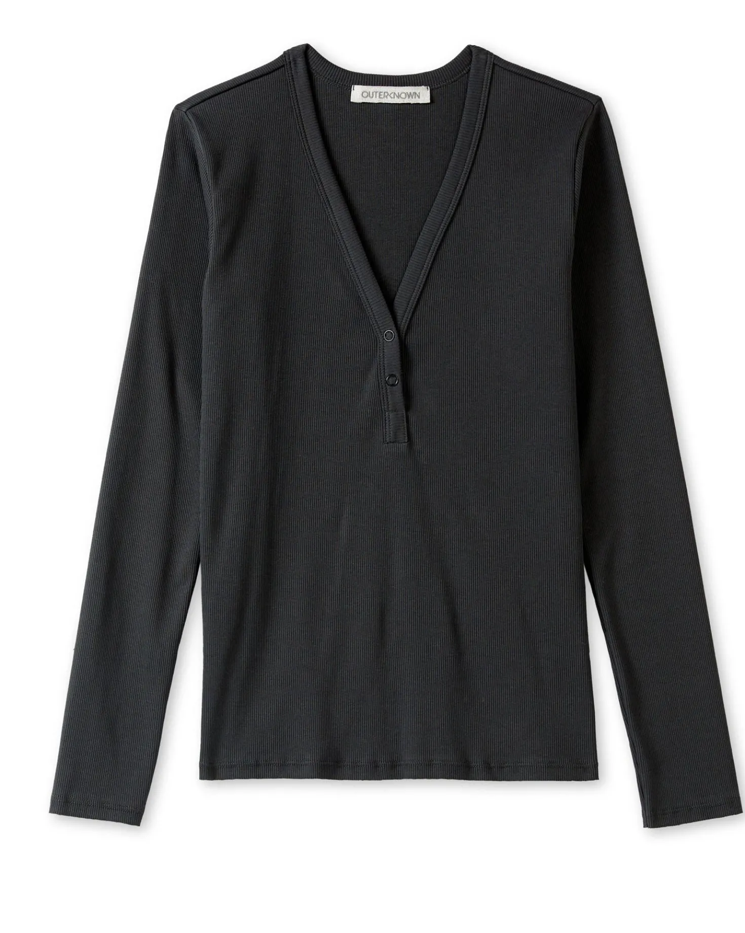 A flattering V-neck henley with snap closure on a rib binding placket.